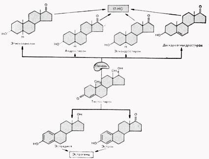 Биосинтез стероидов в организме осуществляется главным образом семенниками, корой надпочечников и яичниками при участии печени. Образование эстрогенов в организме происходит в основном из андрогенов. При этом вызывающая ароматизацию ферментная система, способная превращать андростендион и тестостерон соответственно в эстрон и эстрадиол, распространена во многих тканях и органах (например, в жировой ткани, лимбических структурах, гипоталамусе, плаценте, в …
