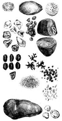 По внешнему виду, форме и цвету камни делятся на следующие 4 группы: преимущественно одиночные крупные — яйцевидной формы, круглые или цилиндрические, поверхность их гладкая или неровная, напоминающая малину; маленькие множественные камни различной формы: круглые, плоские, фасеточные, иногда двояковогнутые или двояковыпуклые, с гладкой поверхностью и зернистые, иногда в виде тутовой ягоды; фасетки образуются от давления соприкасающихся …