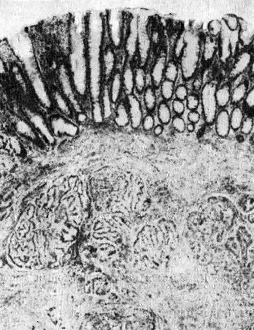 Морфологическая картина подобных образований довольно точно описана некоторыми авторами, но мы продолжаем постоянно встречаться со случаями, когда микроскопическую картину при этой патологии смешивают с аденокарциномой, развившейся в полипе и инфильтрирующей поярку полип. Аденоматозные полипы с кистами подслизистого слоя встречаются реже, чем истинные аденокарциномы в полипе (в 2,4% случаев, по наблюдениям Т. Muto и сотр.; авторы …