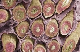 На снимке Цветного сканирующего электронного микроскопа (SEM) срез семенных канальцев, места, где вырабатывается сперма в яичках человека. Каждый каналец содержит завиток хвостиков формирующихся сперматозоидов (белые/зеленые) в центре. Канальцы покрыты морщинистым многослойным эпителием, содержащим два вида клеток: клетки Сертоли, которые питают развивающиеся сперматозоиды, и сперматогенные клетки, из которых образуются сперматозоиды в процессе, известном как сперматогенез. Далее, …